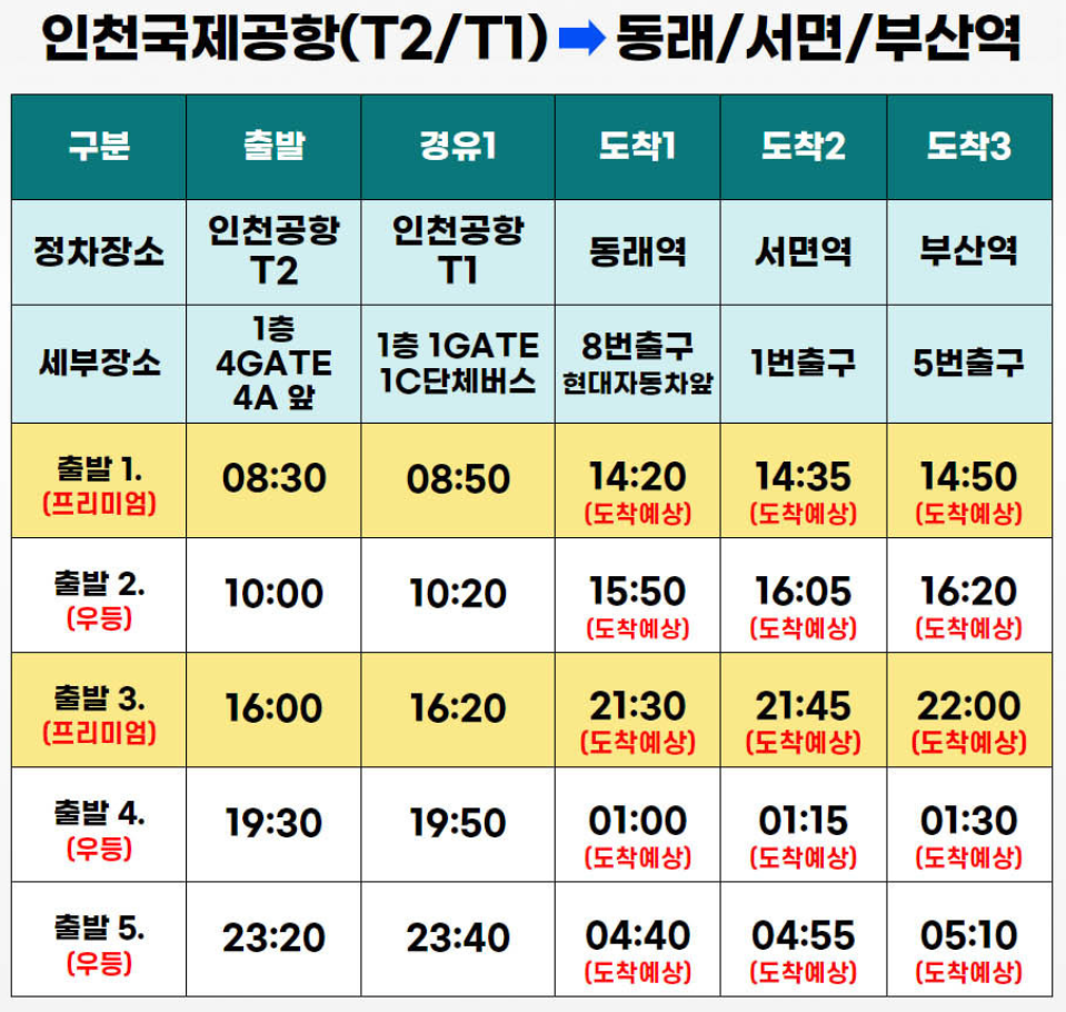 부산에서 출발하는 리무진은 1️⃣부산역에서 서면, 동래를 거쳐가는 버스편, 2️⃣해운대에서 정관을 들러서 인천공항으로 가는 버스편 두 가지 입니다.